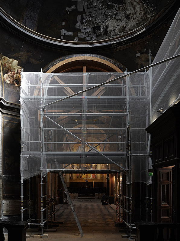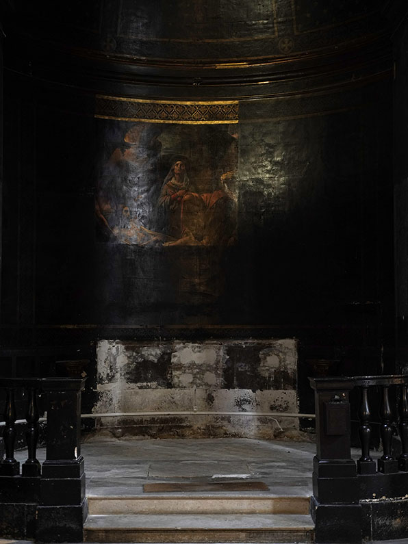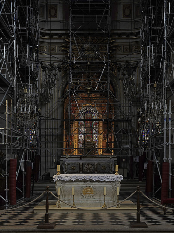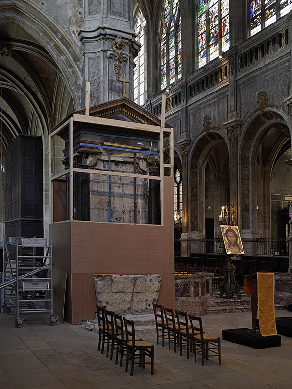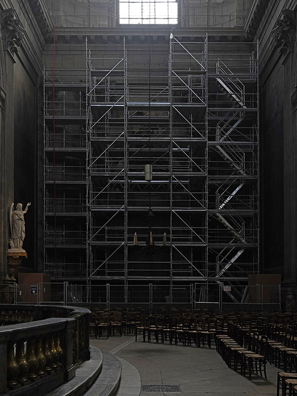 Mai 2022, je pénètre dans l’église Notre-Dame de Lorette et découvre, aussitôt la porte d’entrée franchie, un échafaudage. C’est la rencontre du profane avec le sacré qui est là pour rappeler que ce dernier ne peut advenir sans le côté terre à terre d’objets matériels…